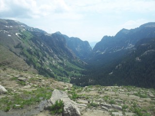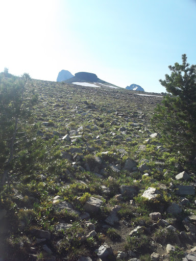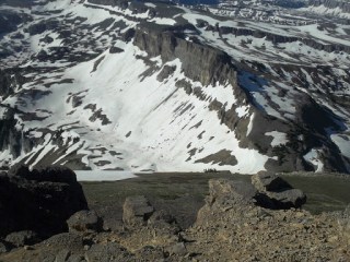 Climbing down to the saddle South of Table was a little scary. I ended up doing some 4th class down-climbing along the wall of a snow-filled gully for several hundred feet. The rock was poor and most solid surface were covered with slippery gravel. It went slowly, but it went. Fortunately, immediately afterwards, I was treated to a magical glissade down two snowy bowls, before having to do some mild bushwhacking to reach the S. Fork Cascade trail.