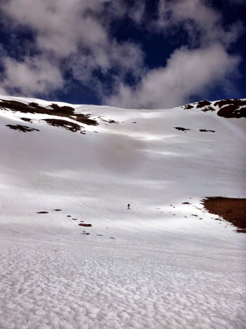 It was apparent that conditions were game-on; the refreeze the night before, the countless freeze/thaw cycles, and the low high for the day meant that just about anything was suitable for safe skiing. As we climbed back up towards Red Mountain, we saw that the next sub-peak to the south (Blonde Mountain?) held another vast northeast face, that rolled from a mellow face onto a big and exposed affair bisected by cliffs, that looked superb. We quickly walked to the top of the face and dropped in. The top of the roll-over was spooky and confusing, but Casey quickly found the appropriate chute descending through the cliffs, and we regrouped at a tarn at the bottom of the face.