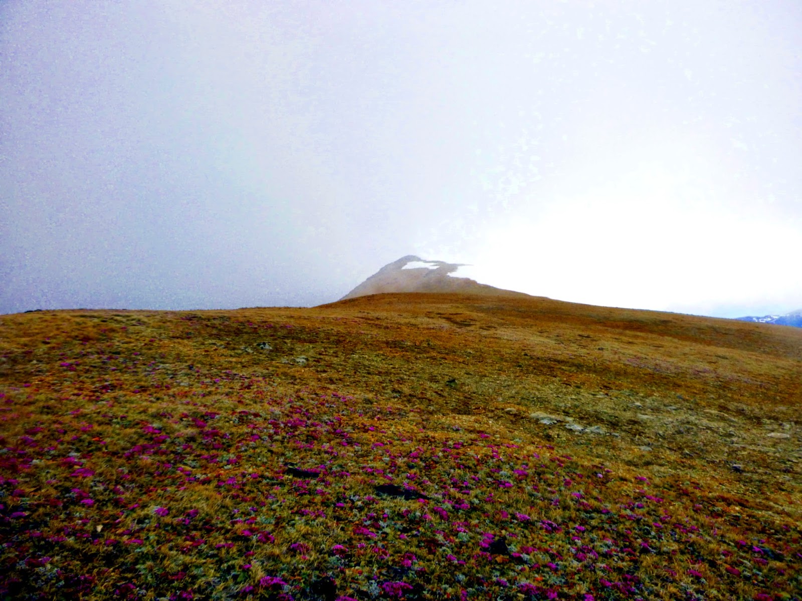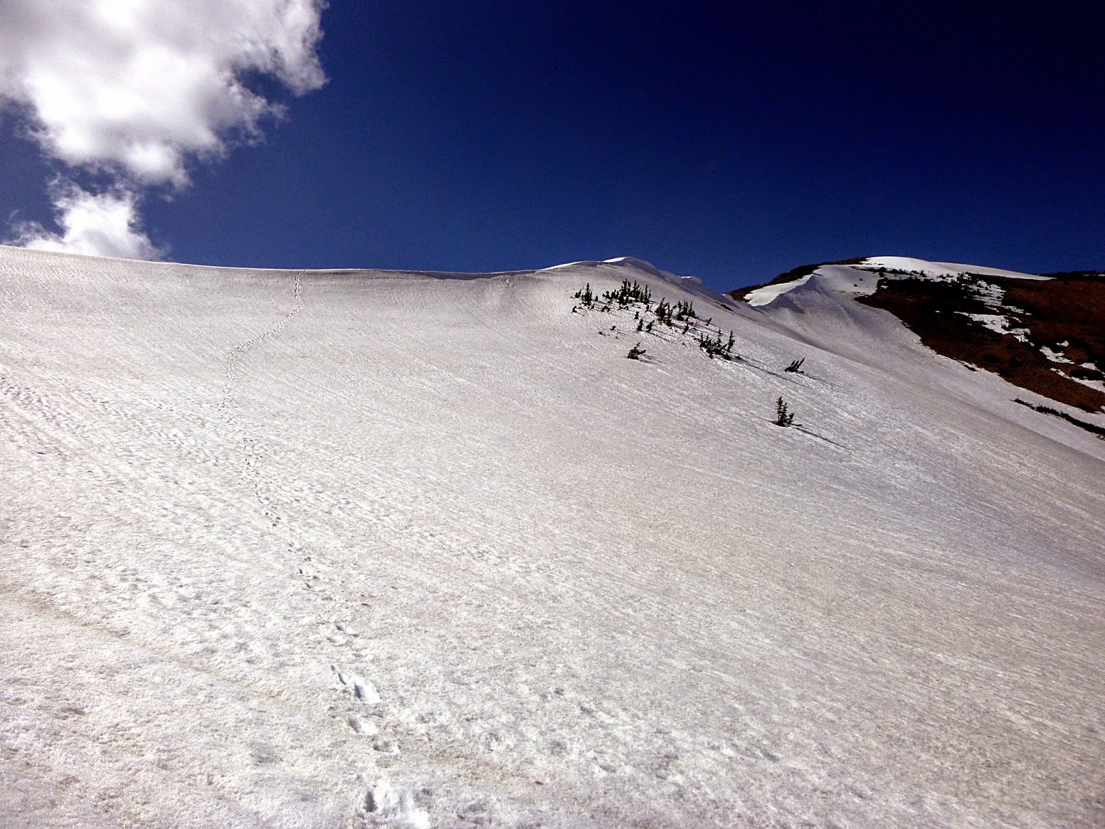 We walked the ridge for a few miles, admiring the flowers, getting blasted by icy wind, and crossing deeply sunken grizzly tracks left by a very large bear on a much warmer day. The ridge walking was easy (with the exception of a short third class step) and pleasant, and the bowls on leeward aspects were well filled in, though absolutely bulletproof. The ridge ascends and descends two sub-peaks before reaching the summit of Red Mountain.