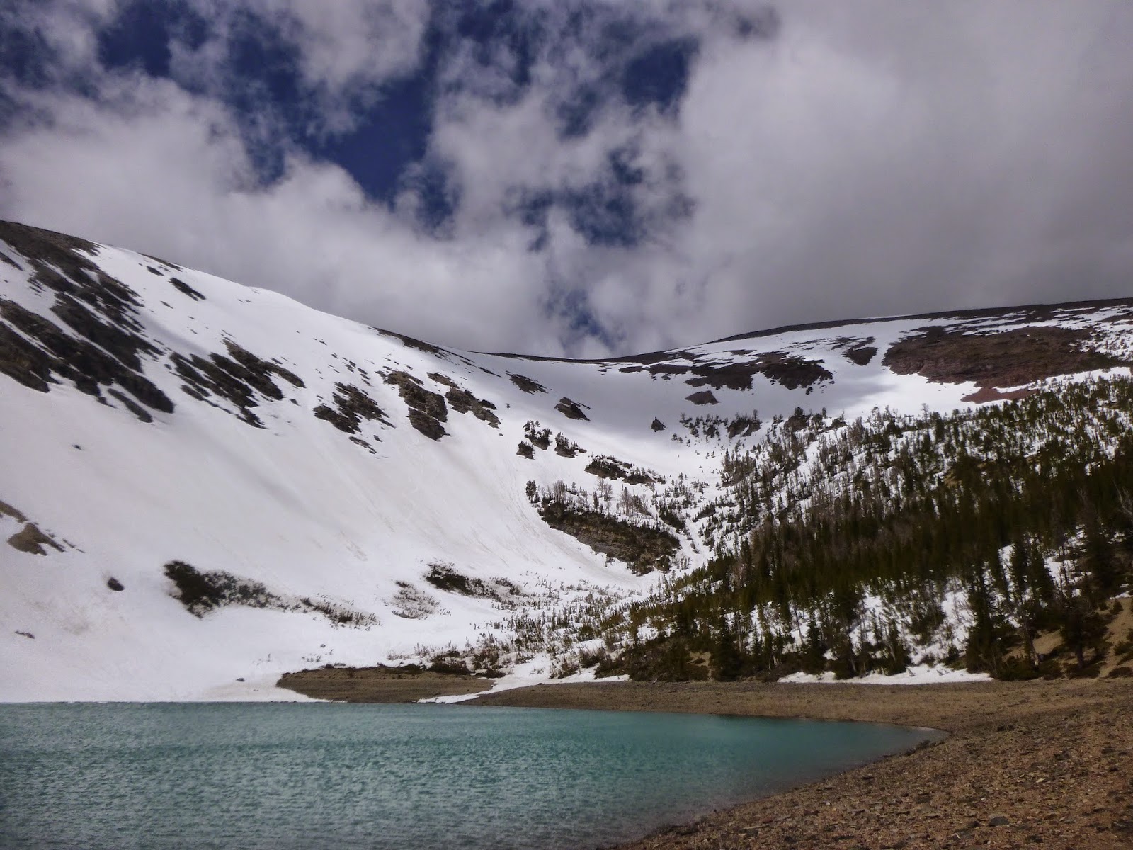 We left Missoula at 4:45, driving eastward, and keeping pace with cloudy skies and a rapidly departing cold front. After an hour or so, we turned up the Lander’s Fork, and then Copper Creek, where we got our first glimpse of a large couloir off of a subsidiary peak to our objective. There was a lot of snow in the valley. There wasn’t very much snow on Red Mountain.