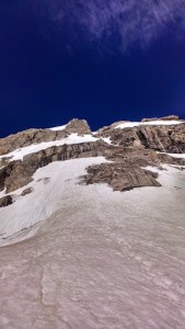 | Overlooking the Schrundel. A few minutes later, a large section of the snowfields on the East Face of the Middle Teton would break off and go careening down the runnel and into the bowels of the glacier. |